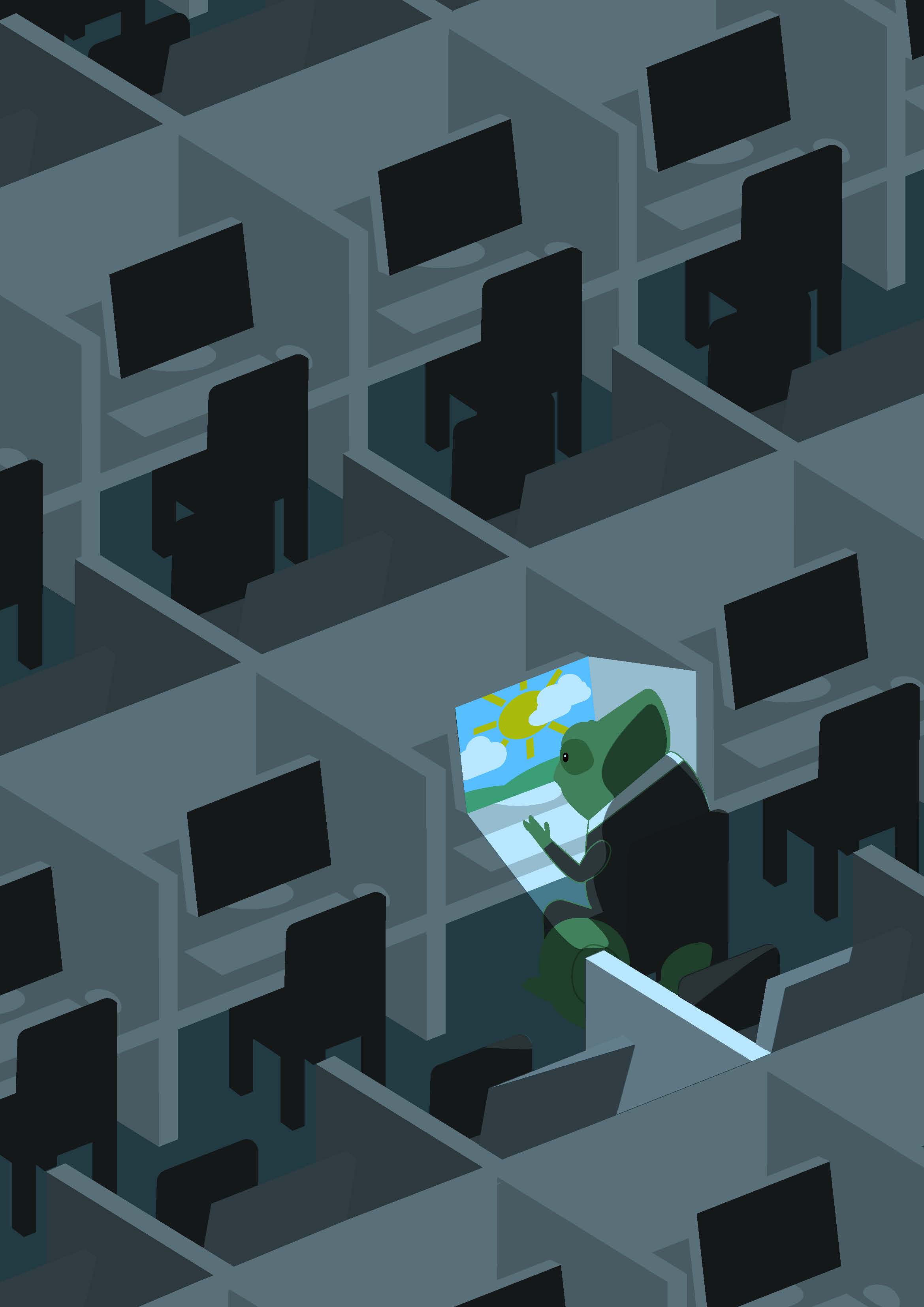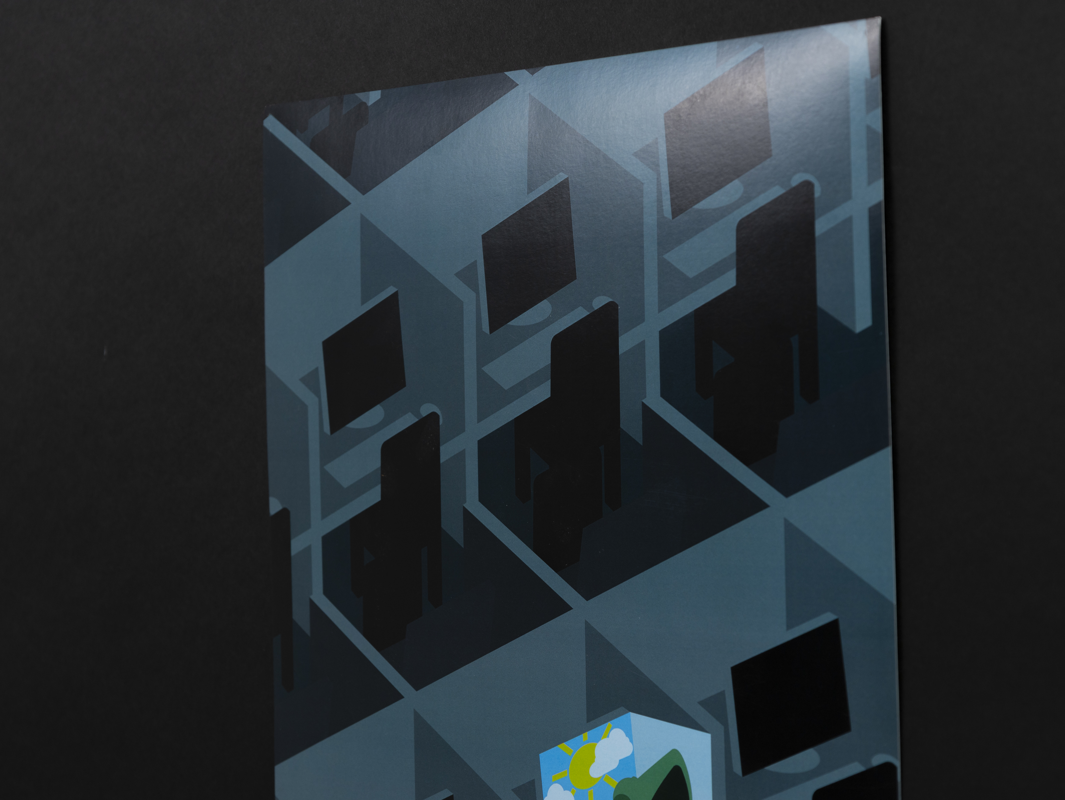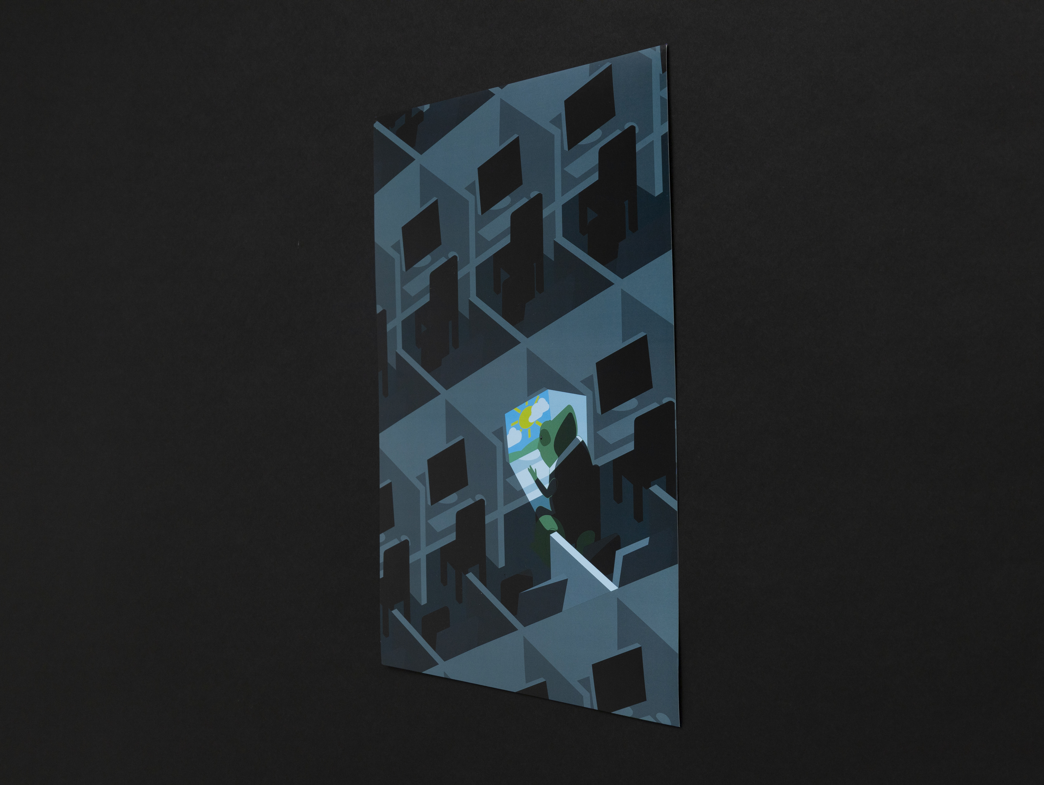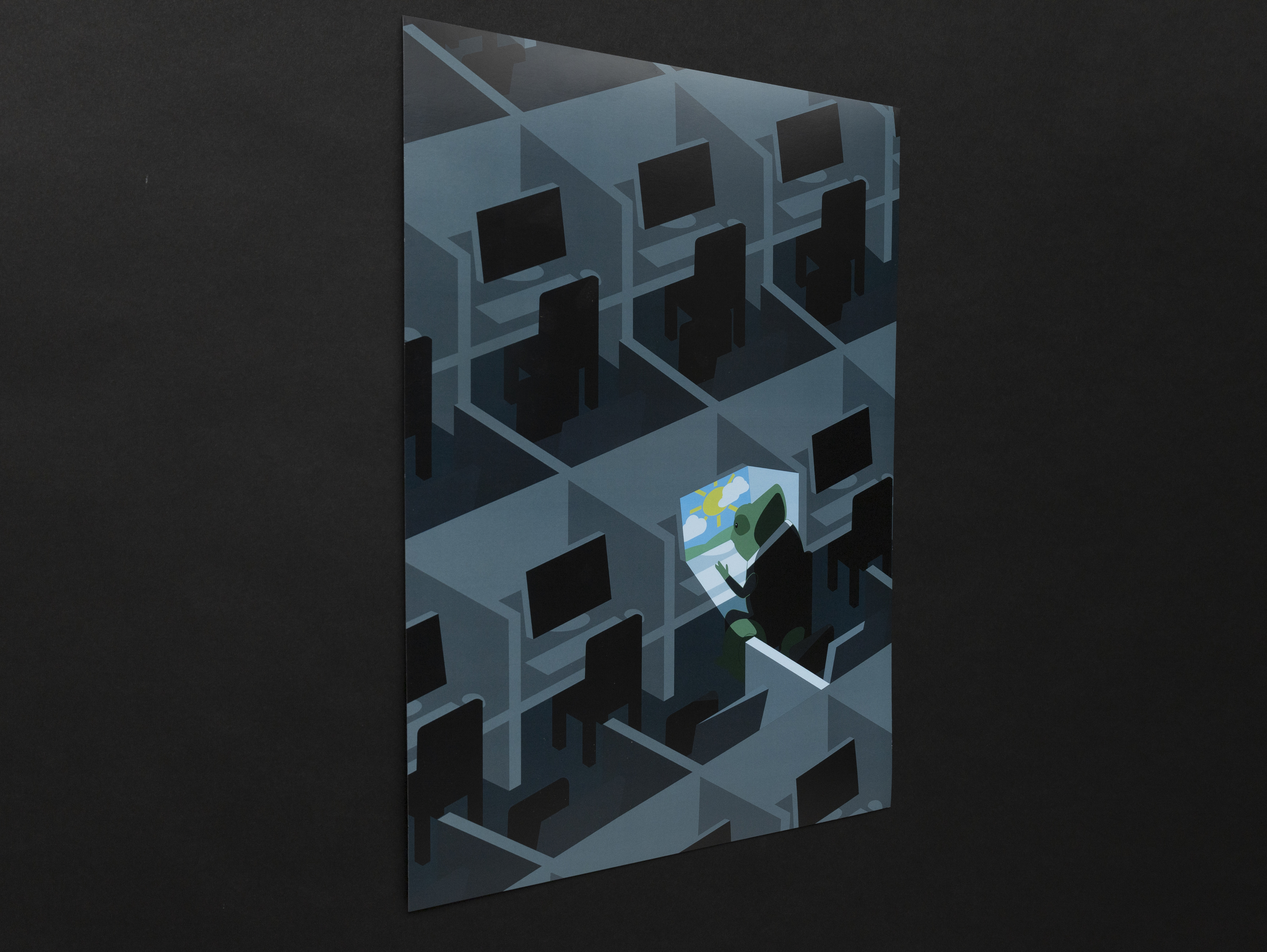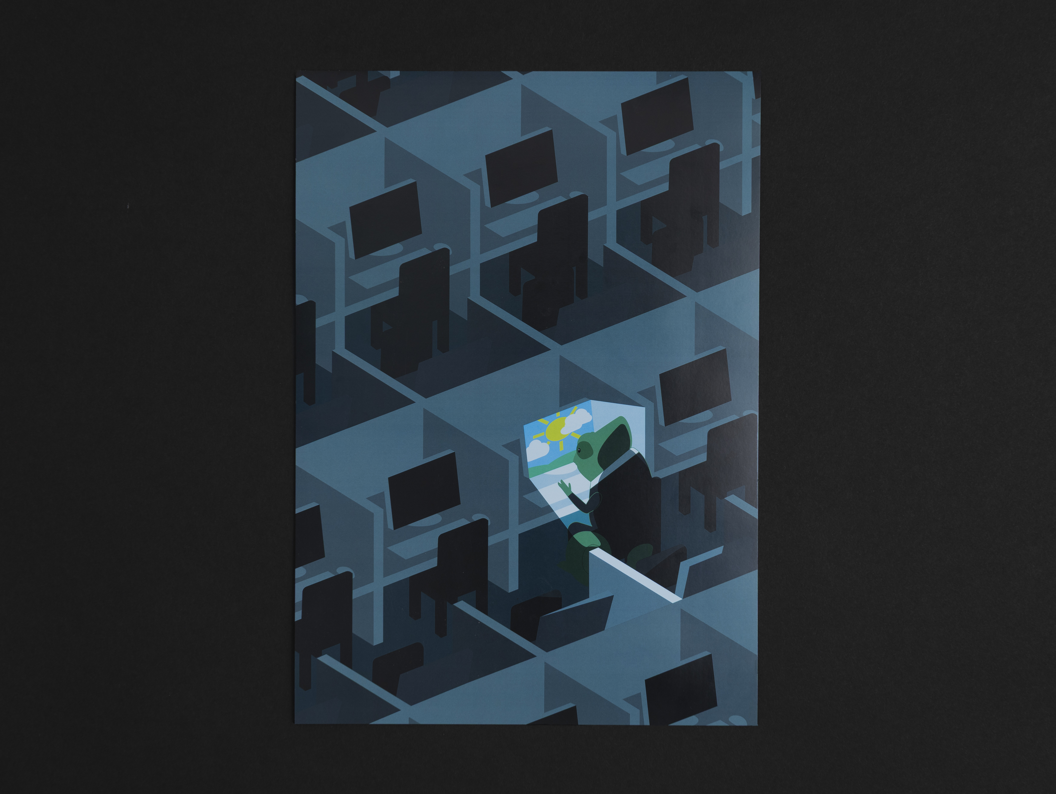 Hast du dich je an einer Gruppe angeschlossen, doch dich anders als alle anderen gefühlt? Hier habe ich es gestalterisch auf einem Plakat gestaltet, wobei ich möglichst versucht habe, ohne Worte es dem Zuschauer zu übermitteln. Die Chamäleons sind eine berühmte Symbolik dafür, sich anzupassen und dadurch zu verstecken. Diese Symbolik habe ich dann so ausgenutzt, indem ich das Chamäleon in einer modernen Situation hineingesteckt habe. Denn so kann das Publikum auch, falls es zu ihrer Situation passt, sich betroffen und verbunden fühlen.
