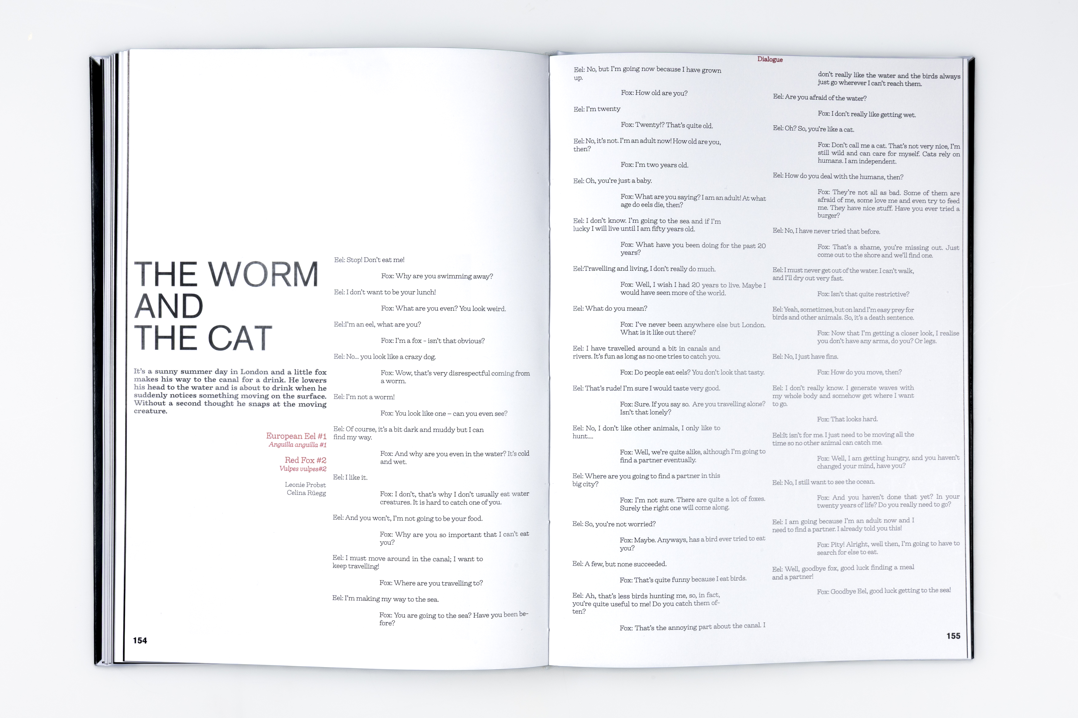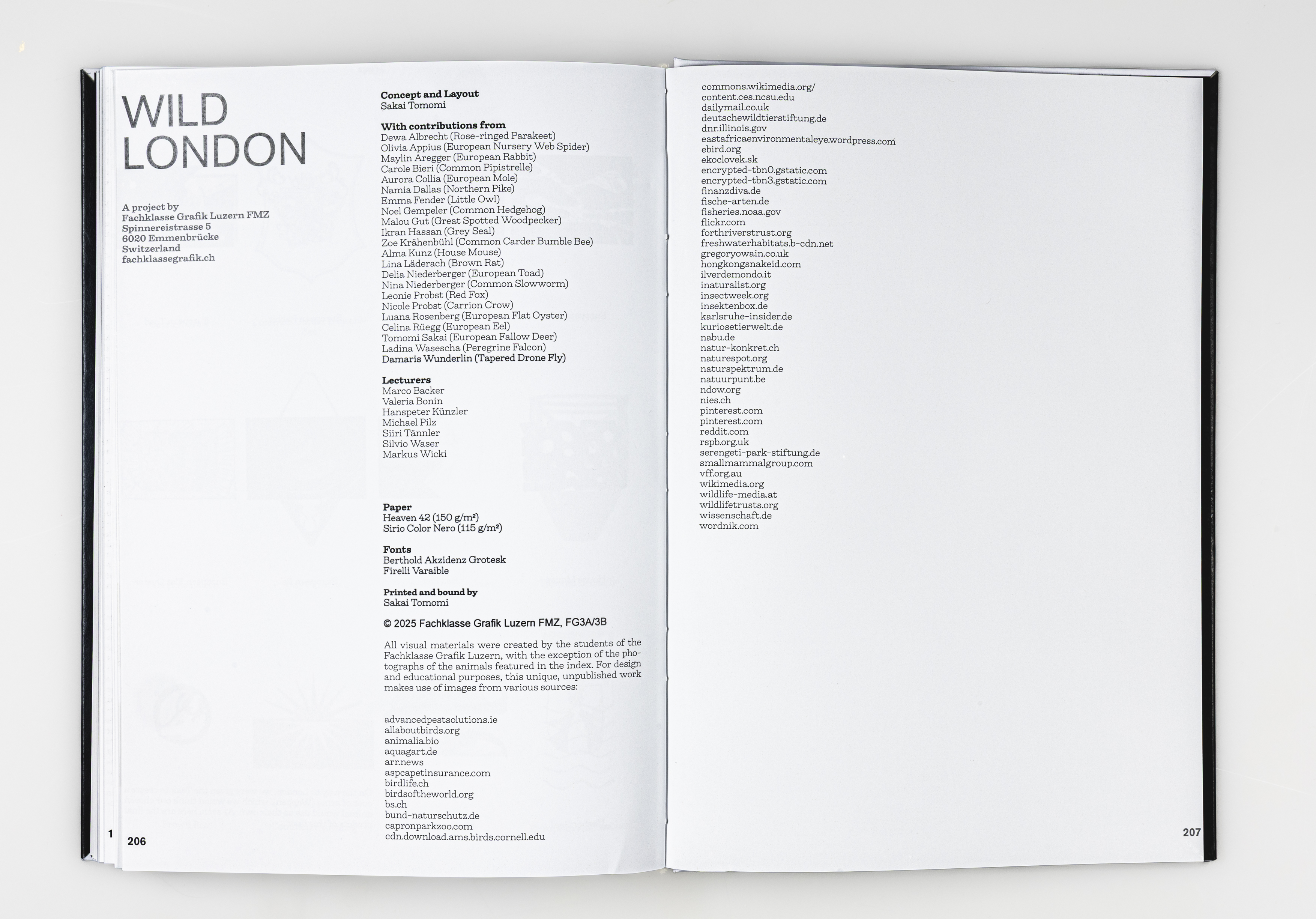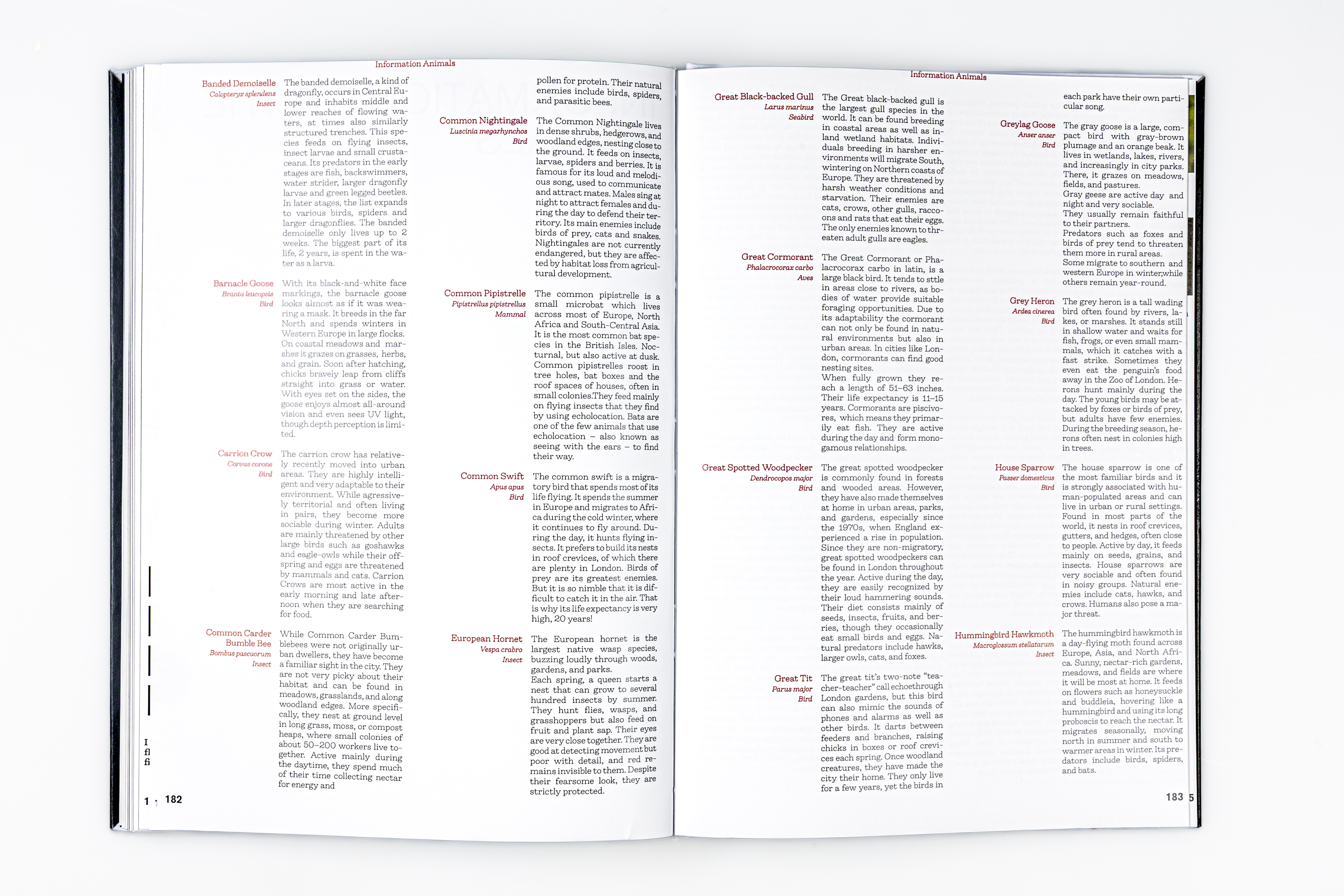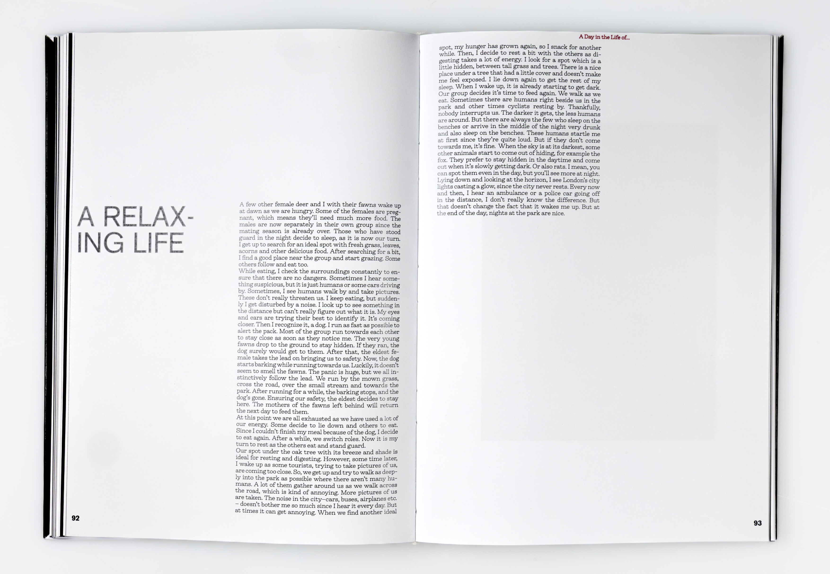 Da London eine Grossstadt ist, erwartet man kaum eine grosse Vielfalt an Wildtieren, doch dieses Buch zeigt das Gegenteil. Es stellt 88 Tiere vor, 22 davon im Detail. Jedes Tier erhält drei Doppelseiten: eine Geschichte aus seiner Sicht, eine 4er Fotoserie eines Tagesausschnitts und einen Dialog mit einem anderen Tier. Am Ende finden sich Beschreibungen und Fotos zu allen Arten. Das Layout folgt einem klaren Konzept: Die Tiere sind nach ihrem Lebensraum geordnet. Fliegend, laufend oder unter Wasser.