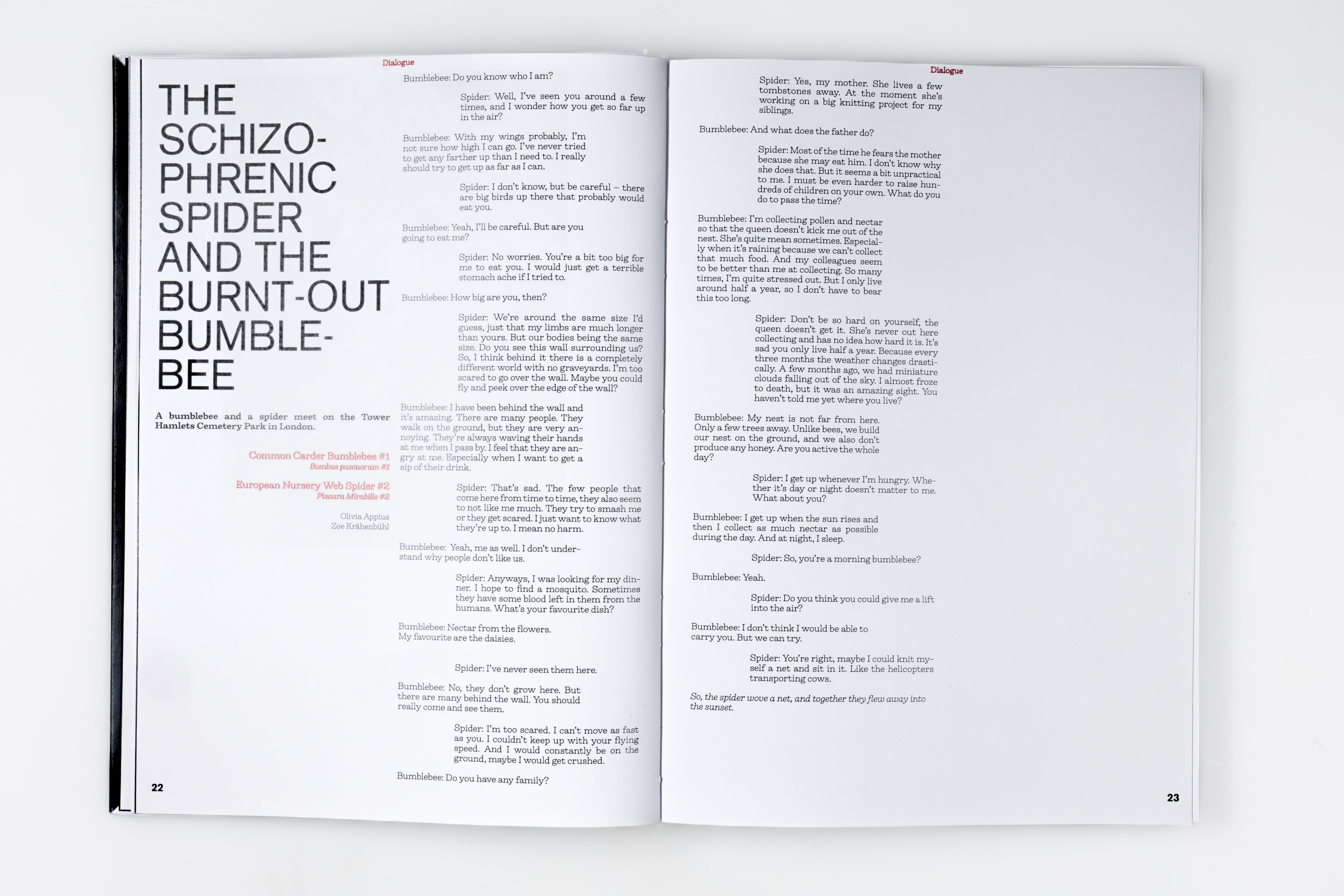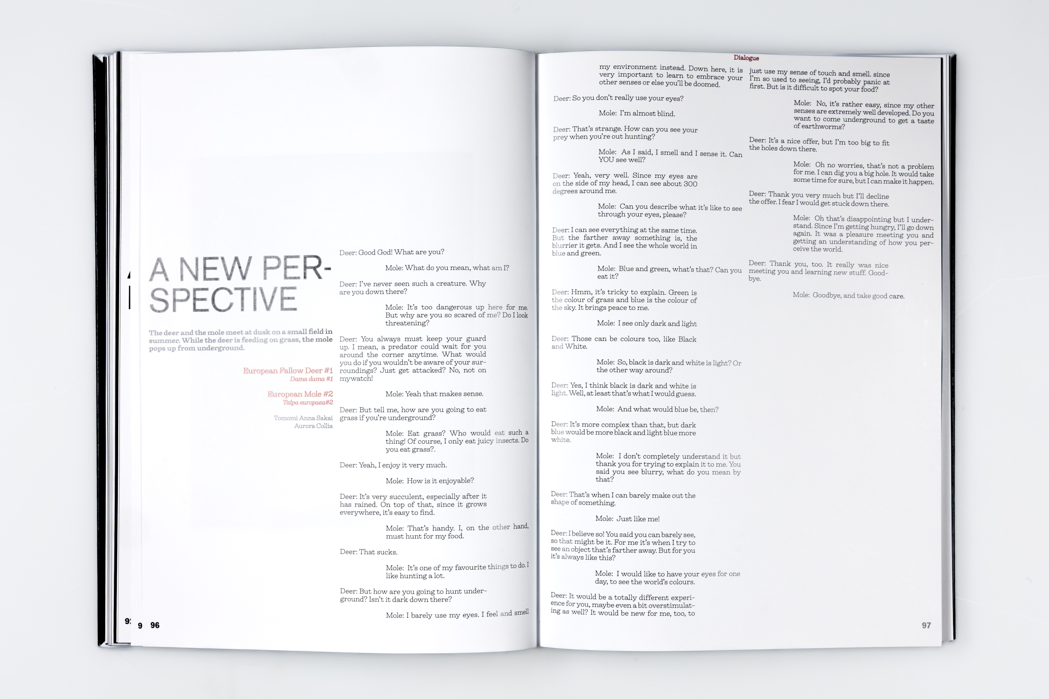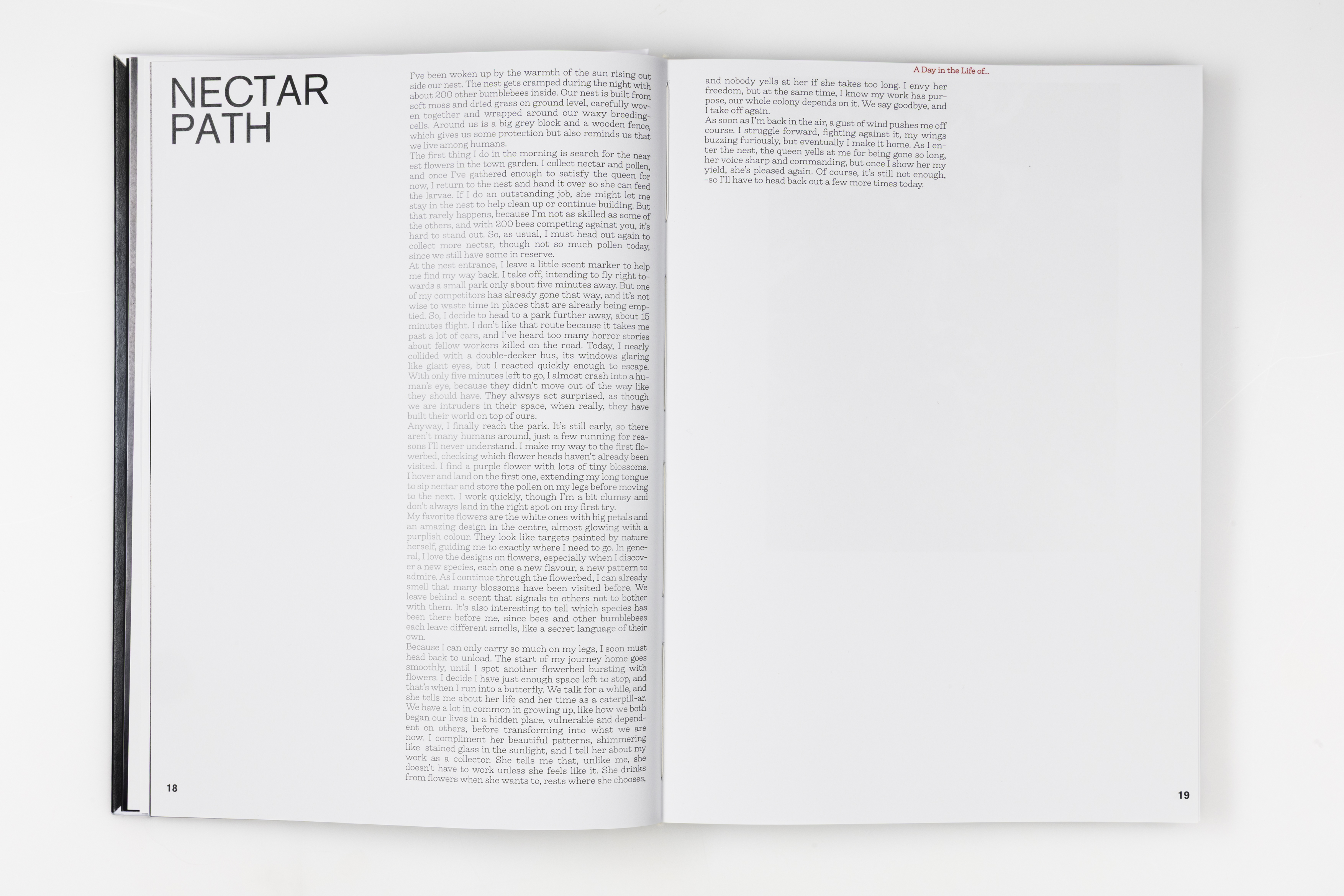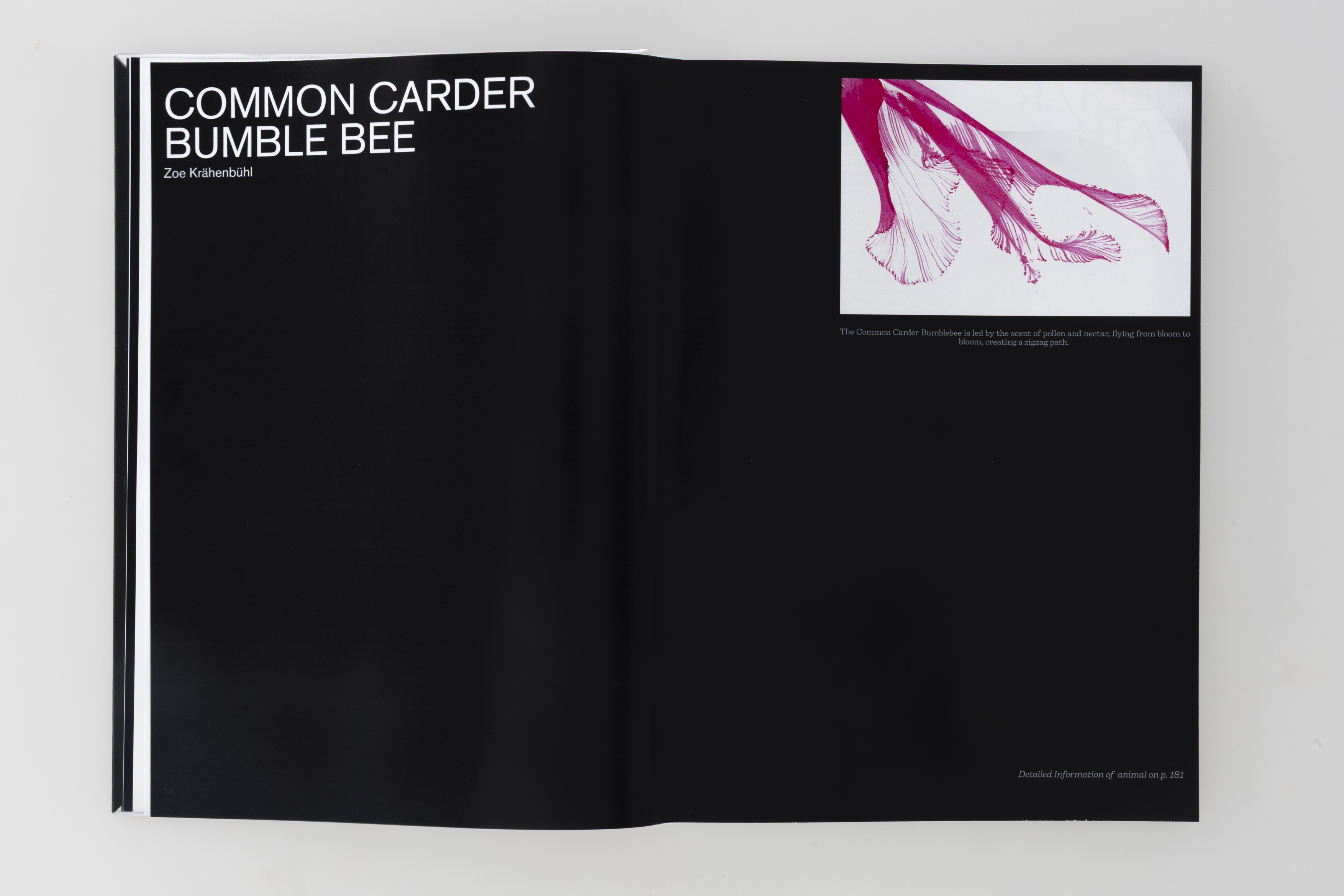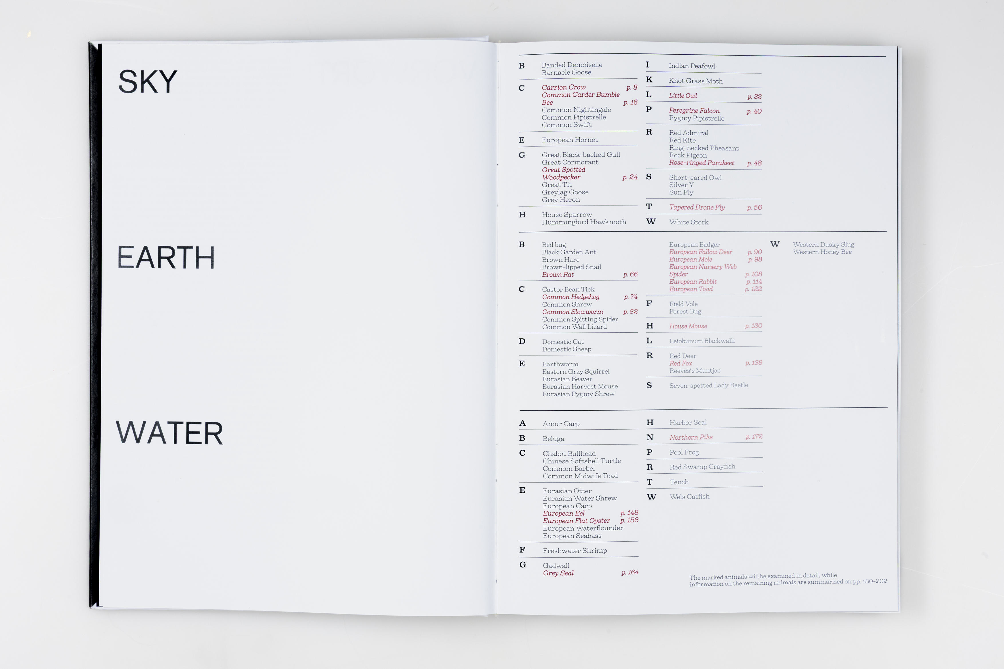 Da London eine Grossstadt ist, erwartet man kaum eine grosse Vielfalt an Wildtieren, doch dieses Buch zeigt das Gegenteil. Es stellt 88 Tiere vor, 22 davon im Detail. Jedes Tier erhält drei Doppelseiten: eine Geschichte aus seiner Sicht, eine 4er Fotoserie eines Tagesausschnitts und einen Dialog mit einem anderen Tier. Am Ende finden sich Beschreibungen und Fotos zu allen Arten. Das Layout folgt einem klaren Konzept: Die Tiere sind nach ihrem Lebensraum geordnet. Fliegend, laufend oder unter Wasser.