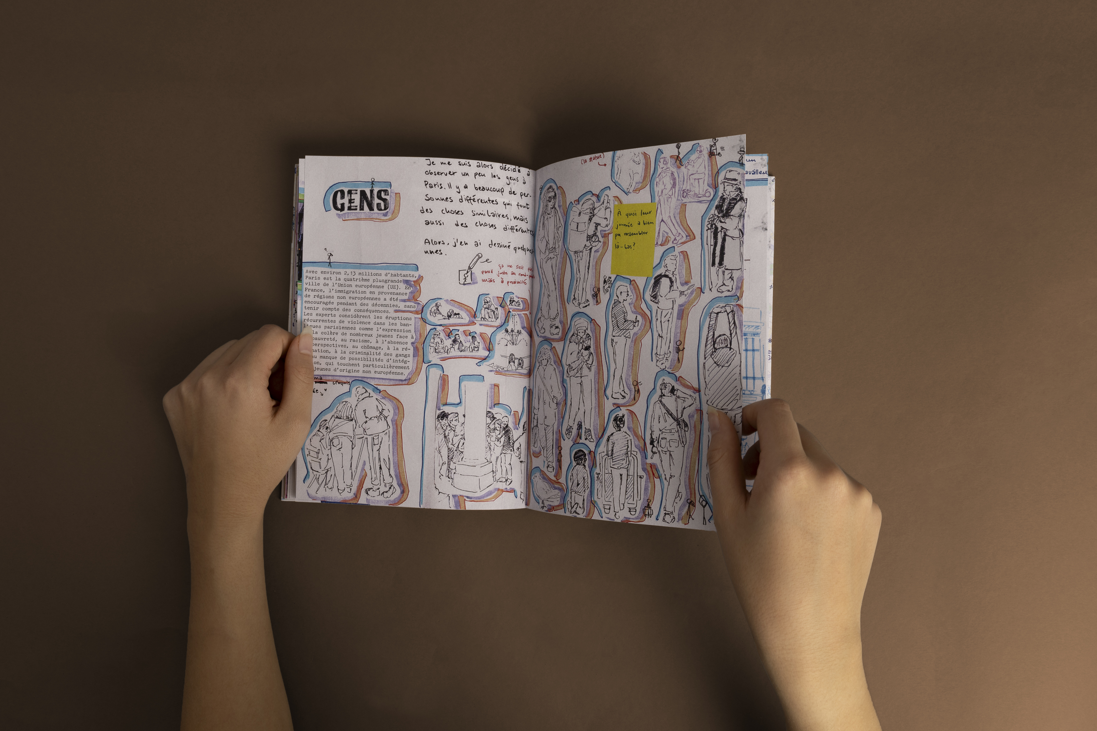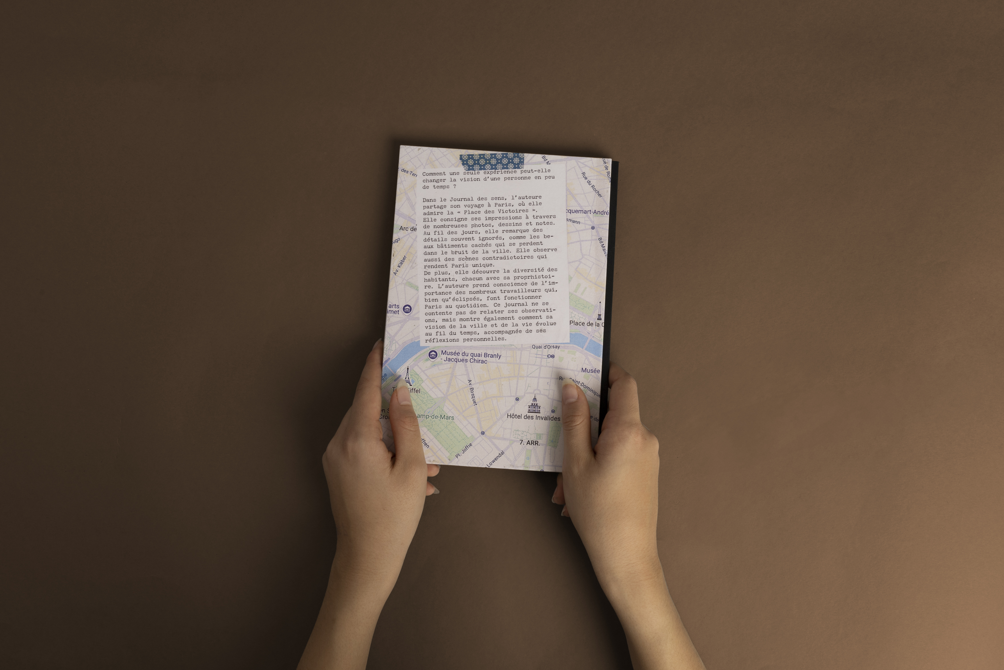 Wie kann eine einzige Erfahrung die Sichtweise einer Person in kurzer Zeit verändern? Im Journal des sens (Tagebuch der Sinne) berichtet die Autorin von ihrer Reise nach Paris, wo sie den „Place des Victoires” bewundert. Sie hält ihre Eindrücke in zahlreichen Fotos, Zeichnungen und Notizen fest. Im Laufe der Tage fallen ihre Details auf, die oft übersehen werden, wie zum Beispiel versteckten Gebäuden, die im Lärm der Stadt untergehen. Darüber hinaus entdeckt sie die Vielfalt der Einwohner, von denen jeder seine eigene Geschichte hat. Dieses Tagebuch beschränkt sich nicht darauf, ihre Beobachtungen wiederzugeben, sondern zeigt auch, wie sich ihre Sicht auf die Stadt und das Leben im Laufe der Zeit verändert, begleitet von ihren persönlichen Reflexionen.